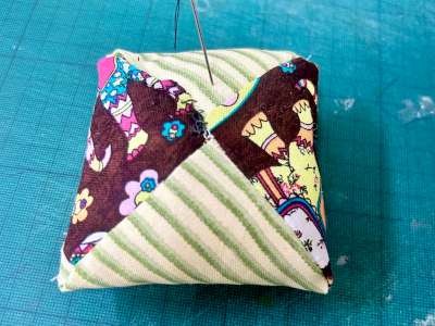 Create a square pin cushion by straight-stitching together four patches of coloured fabric and filling it with stuffing.